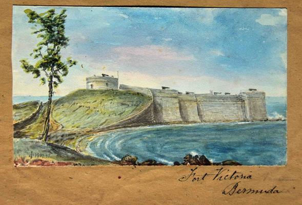 Scott, Captain Andrew. Fort St. Catherine (Incorrectly named Fort Victoria), Bermuda. c1857. watercolour. 6 x 3 1/2 inches. Fort St Catherine (mistakenly called Fort Victoria). Capt. Scott’s depiction of the fort is attractive and accurate. Note the ramparts are bristling with armour all aimed at the vulnerable channel to the north east. |