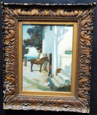 Chapman, Charles Shepard (American 1879 - 1962). Horse and Rider, Bermuda, 1906. Oil on artist's board. 12 x 9 inches. Signed and dated lower left. Original moulding, under glass The scene seems to be Old Maid's Lane, St Georges looking towards the harbour, but before additional buildings were erected which largely block the view. |